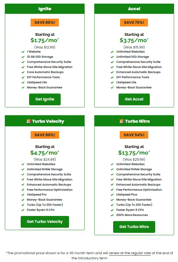 A2 Hosting’s Black Friday web hosting deals are all based on 36 months, so the initial cost is higher than the 12-month offers you see elsewhere, but you are locking in three years of excellent hosting at a reasonable price. For example, you can get 36 months of the Turbo Velocity plan for $177.00 or ($4.75/mo). So you pay $59/year for three years of great high-speed hosting. That’s the best Black Friday web hosting deal for 2024!