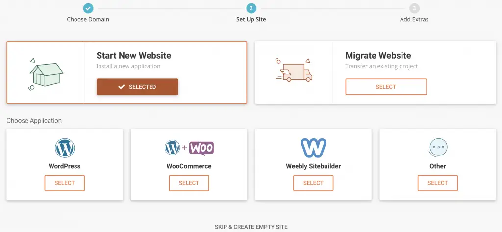 As an aside: if you click ‘Other’, you get a long list of software, including Drupal, Joomla, etc. If you want a new website without installing any software, you can click on ‘skip to create empty site’ at the bottom.