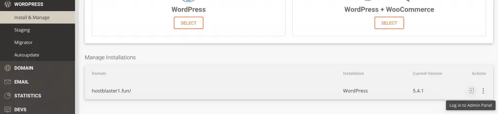 Now you are ready to sign on to your new site! You could of course point your browser at https://<your domain>/wp-admin and sign in, but there is an option on the Site Tools menu to access the site’s admin menu. Select WordPerfect on the left menu, then ‘Install and Manage’, and you will see your site listed under ‘Manage Installations’. Click on the arrow icon under ‘Actions’ on the right and you will be automatically logged in as the site administrator.