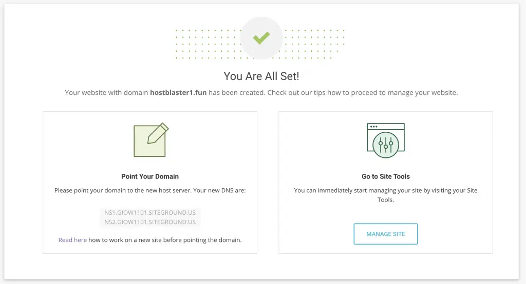 If you select ‘New Domain’, SiteGround will point the new domain at your site for you, whereas if you use an existing domain name, then you will have to sign on to your domain registrar and change the name servers once the new site is active.