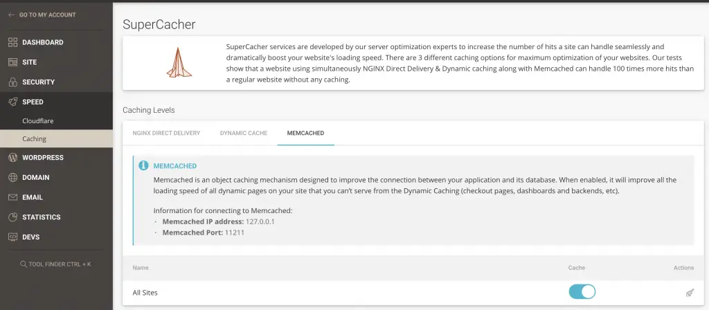 When migrating from wordpress.com, you are obviously concerned about performance, so you want to enable caching. Siteground’s default caching settings are good, but lean towards maximum compatibility, so they can be tweaked to be even better. The first setting I would tweak is for MemCached, which can be used to cache SQL results. Under Caching on the left, pick the MemCached tab, and turn on the switch at the bottom.