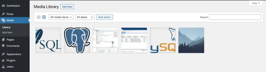 Here’s what the media list looks like after the import (the new site started with one image of mountains):
