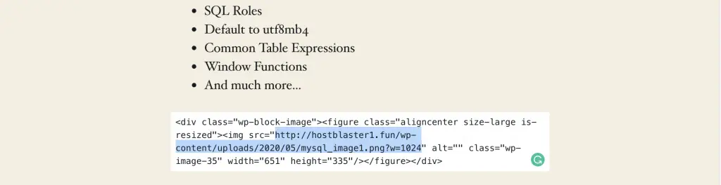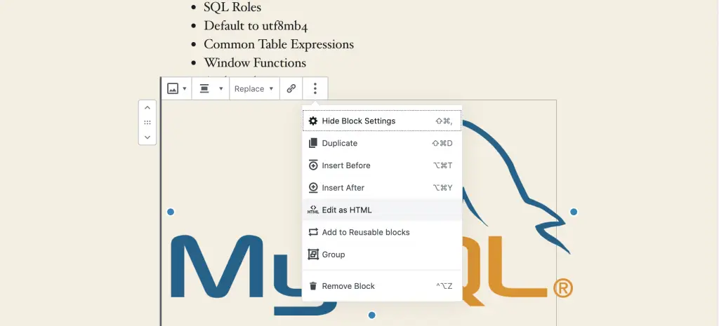 To check the image link, let’s have a look at the HTML. Select the image, click on the three dots, and select ‘Edit as HTML’.