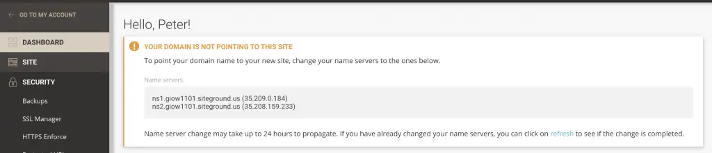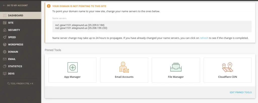 At this point, if you are using an existing domain, you can change the name servers on your domain to point to the SiteGround servers shown for your site. In Site Tools, there are options to set up the site.