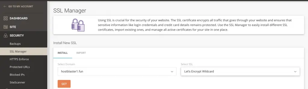 Adding an SSL certificate to enable https has to wait until the domain is pointing to SiteGround, so once the message on the dashboard disappears, you can click on Security / SSL Manager. If you are planning to set up subdomains, you should pick the ‘Lets Encrypt Wildcard’ option.