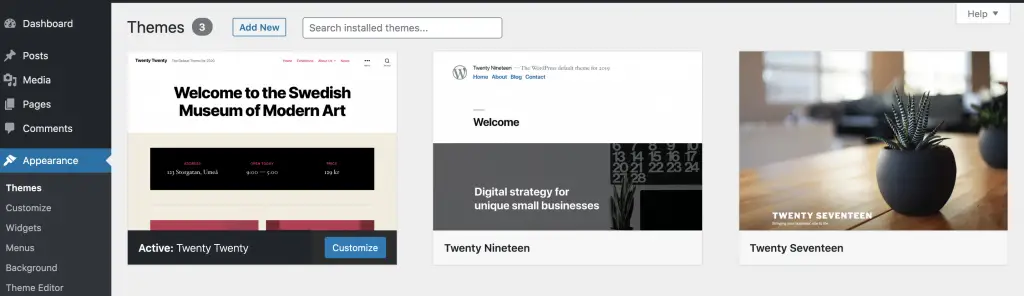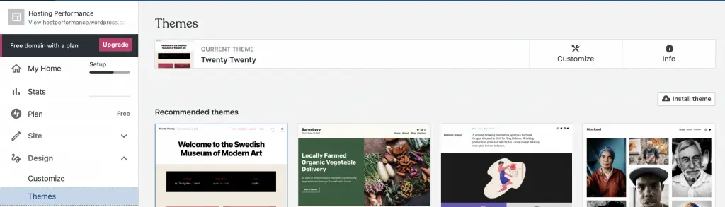 Whether you use the ‘WordPress Starter’ plugin, or simply go to the Appearance / Themes menu option, you will need to pick a theme, and you probably want one that looks the same as the site you are migrating from wordpress.com.