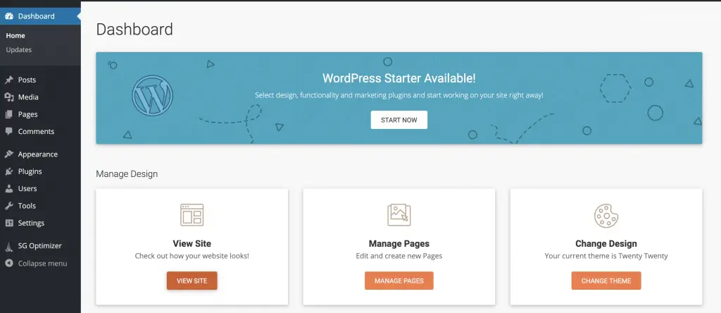 The second is a ‘WordPress Starter’ plugin to assist you in picking a theme and installing a few useful plugins. When you first sign on to your site, you will be taken to this ‘WordPress Starter’. There are only three pages, so you can step through this if you find it useful, or exit to get to the standard wp-admin menu.