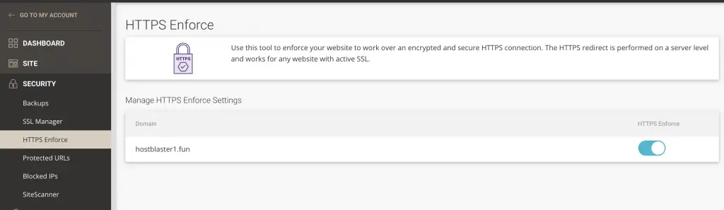 Once the SSL certificate is set up, you should enforce the use of SSL by selecting Security / HTTPS Enforce, and turning on the switch. This just automatically forces anyone accessing the site with http:// to be redirected to https://.