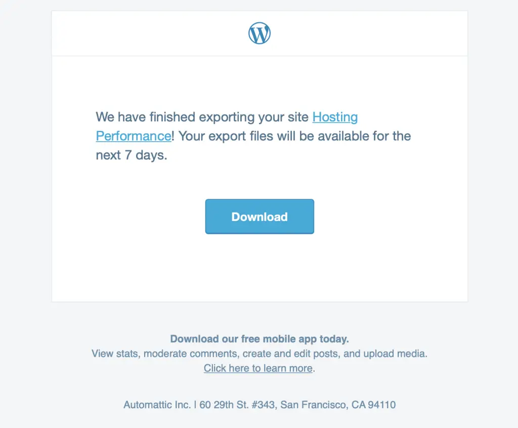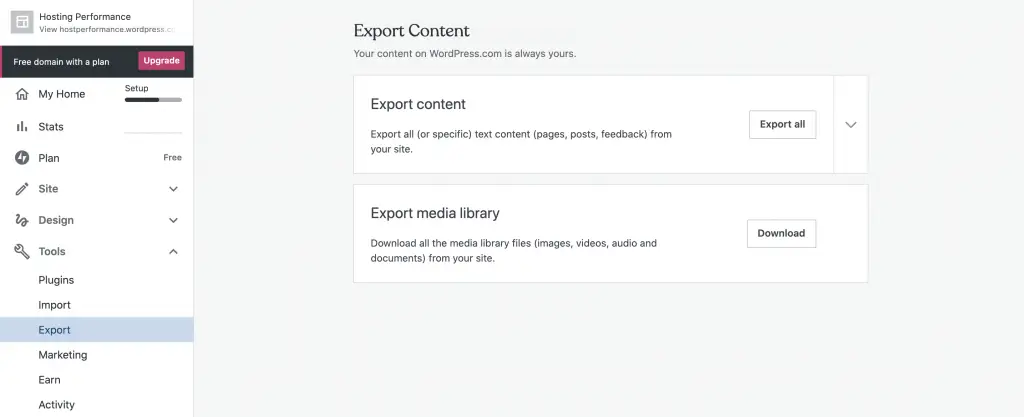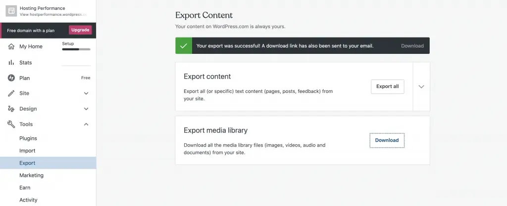 The option we need to use is ‘Export content’, which will email you a link to download a zip file that contains an XML file. Yes, it’s a little convoluted. For most purposes, this XML file is all you need to migrate your site from wordpress.com.